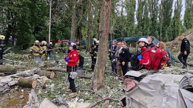 Український Червоний Хрест (УЧХ) надає допомогу на місці чергової комбінованої ворожої ракетно - дронової атаки на Київ.