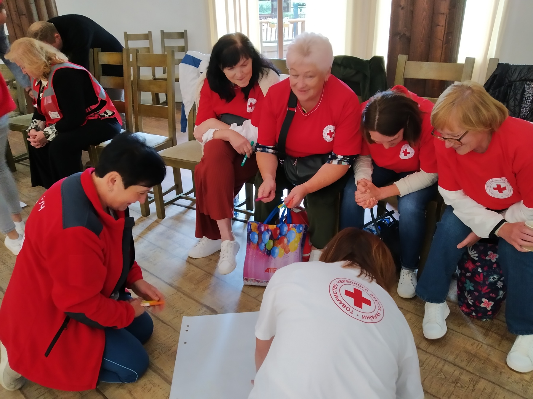 Червонохрестівці поринули у розписування полотняних торбинок різними кольоровими візерунками, щоб зняти стрес, який є частим гостем у їх роботі.