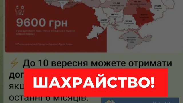 "У мережі поширюється чергова фейкова інформація про виплати від Українського Червоного Хреста. Цього разу шахраї обіцяють виплату у розмірі 9600 грн українцям, які останні 6 місяців не виїжджали за кордон. Наголошуємо, що Український Червоний Хрест не публікував таких оголошень і не здійснює реєстрацію на цю допомогу", - повідомив УЧХ у Фейсбуці у понеділок.