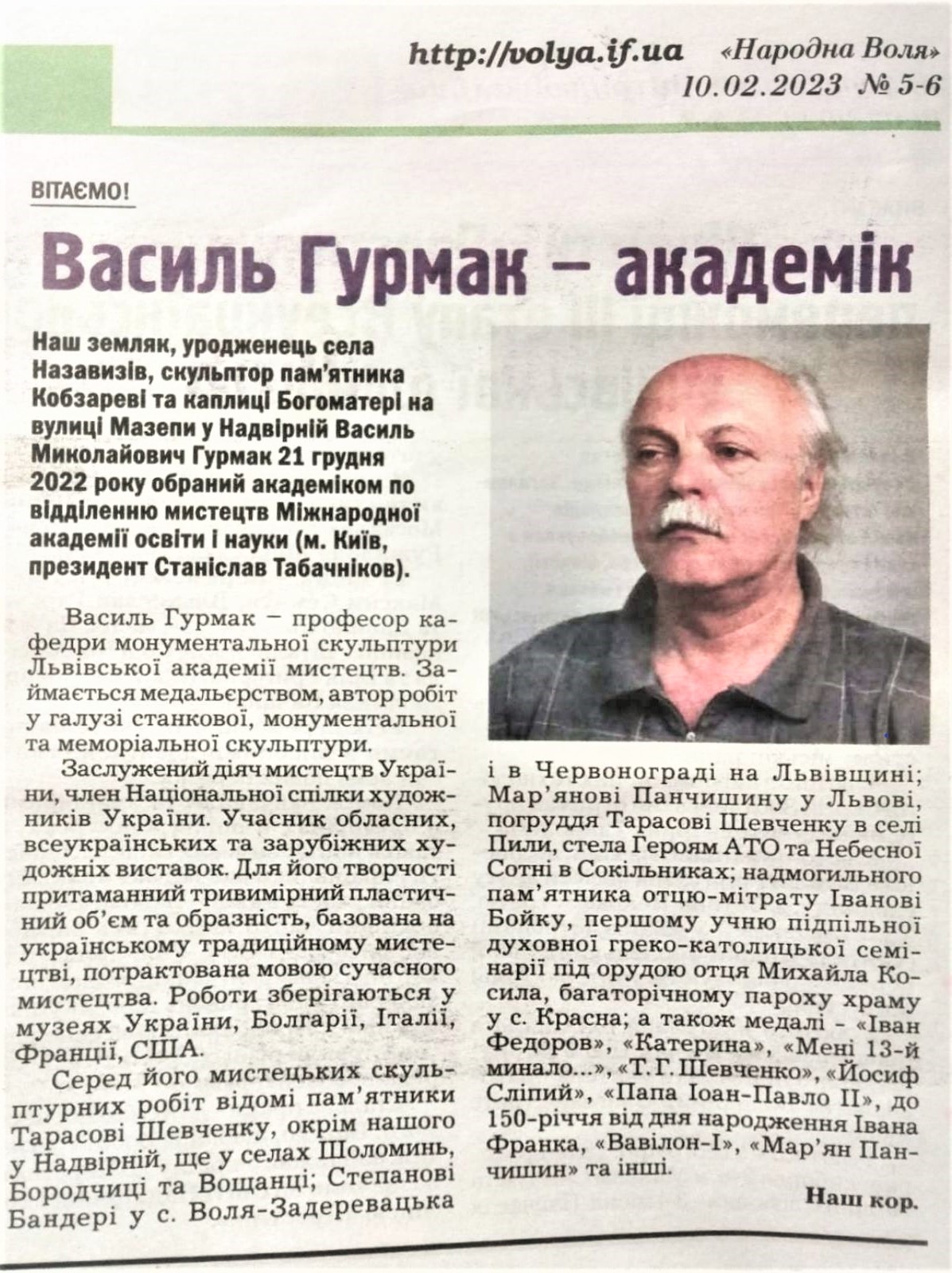 Окрасою рідного м. Надвірна, що на Прикарпатті, став монумент Великому Кобзареві, запроектований і споруджений у майстерні Василя Гурмака ще у 1994 р.