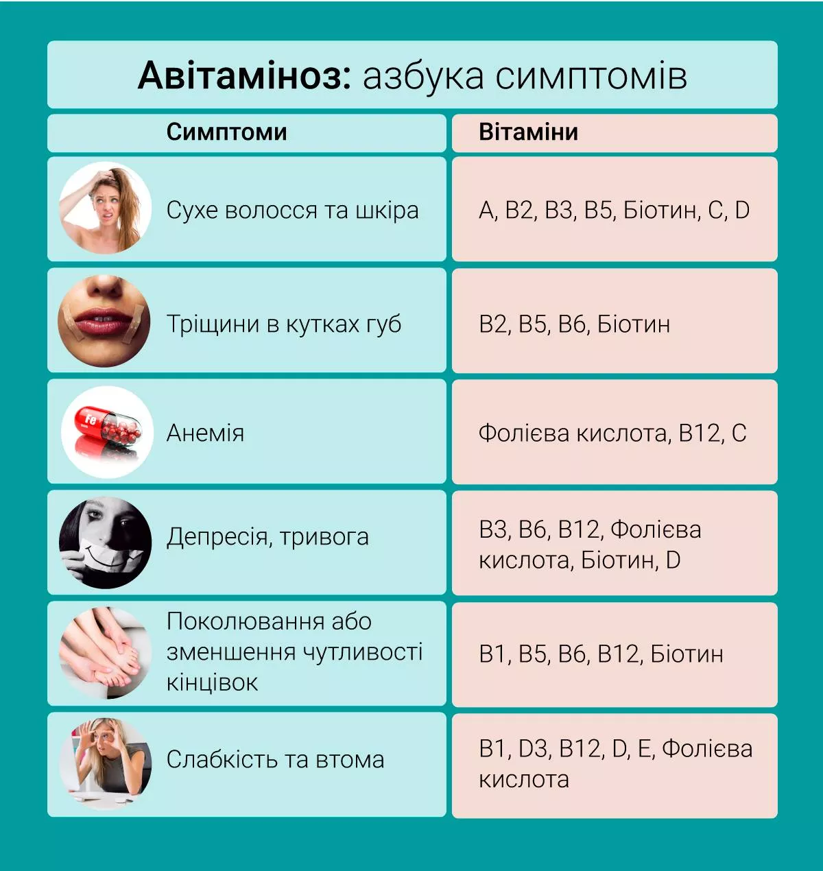 Серед основних симптомів весняного гіповітамінозу: втома та сонливість, сухість шкіри, ламкість волосся і нігтів, зниження працездатності, часті застуди, дратівливість або апатія.